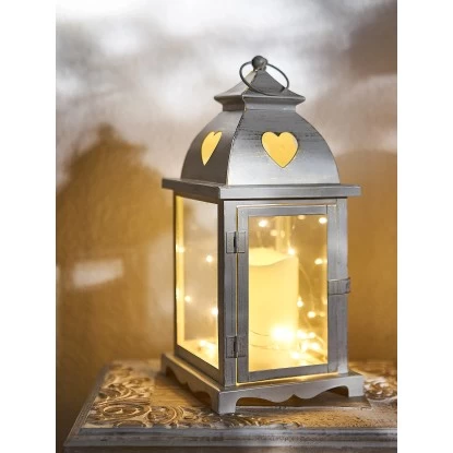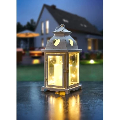 Die Amare Laterne Herzform mit LED-Kerze 2er-Set Weiß 14 cm x 14 cm x 30 cm mit Draht besitzt einen 6 Stunden Timer und bringt ein stimmungsvolles Ambiente in Ihren Garten oder auf Ihren Balkon.