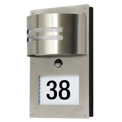 Die Hausnummernleuchte Essex besticht durch modernes Design und höchste Funktionalität. Die Leuchte ist aus rostfreiem Edelstahl und Kunststoffglas gefertigt und ist mit einem Bewegungsmelder ausgestattet. Für die optimale Beleuchtung der Hausnummer sorgen 12 LEDs. Die zusätzliche Leuchte (nicht im Lieferumfang enthalten) wird durch den Bewegungsmelder eingeschaltet. Der Bewegungsmelder verfügt über einen Sensor mit einem Erfassungswinkel von 130 Grad und einer Reichweite von bis zu 8 m. Die Leuchtzeit und die Helligkeitsschwelle kann individuell eingestellt werden.