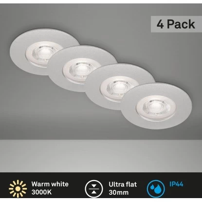 Die Brilo LED-Einbauleuchte Kulana 4 Stk. Chrom matt 4,9 W hat eine fest verbaute LED-Platine mit 4,9 Watt und einer Lichtleistung von 480 Lumen. Die Leuchte hat eine warmweiße Lichtfarbe. Sie ist mit der Schutzart IP44 vor Spritzwasser geschützt und somit auch für den Badbereich geeignet. Die Einbauleuchte kommt im praktischen Viererset. Das Einbaumaß hat einen Durchmesser von 68 mm und die Einbauhöhe beträgt 30 mm.