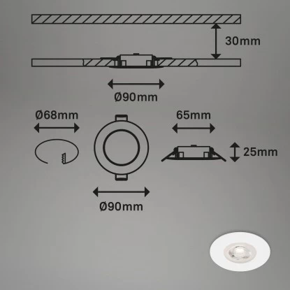 Die Brilo LED-Einbauleuchte Kulana Dimmbar 4 Stk. Weiß 4,9 W hat eine fest verbaute LED-Platine mit 4,9 Watt und einer Lichtleistung von 480 Lumen. Die Leuchte hat eine warmweiße Lichtfarbe und kann über einen herkömmlichen Wandschalter in Stufen gedimmt werden. Sie ist mit der Schutzart IP44 vor Spritzwasser geschützt und somit auch für den Badbereich geeignet. Die Einbauleuchte kommt im praktischen Viererset. Das Einbaumaß hat einen Durchmesser von 68 mm und die Einbauhöhe beträgt 30 mm.