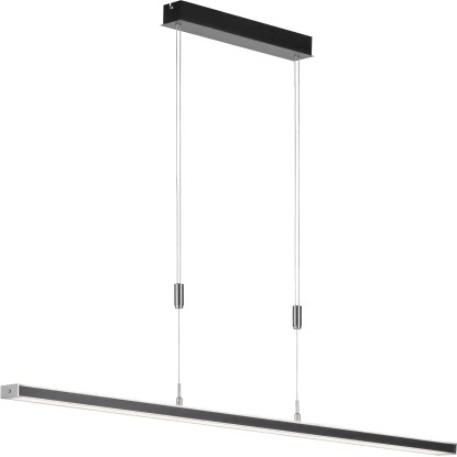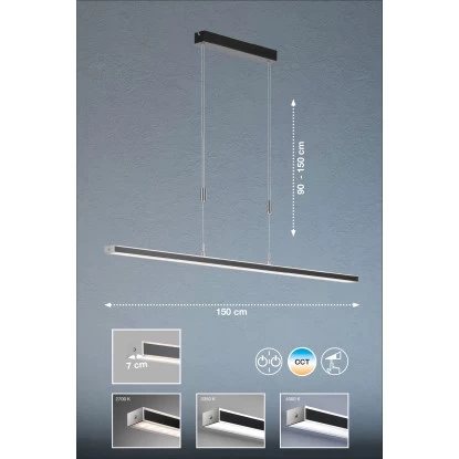 Durch die moderne Oberfläche in sandschwarz matt/nickelfarben matt und dem satinierten Acrylglas findet dieses Modell automatisch einen besonderen Platz in jedem Wohn- Essbereich. Mit einer Länge von 150 cm und einer Breite von 7 cm leuchtet sie jeden Tisch optimal aus und lässt durch die Höhenverstellbarkeit von 90-150 cm auch in diesem Bereich keine Wünsche offen.