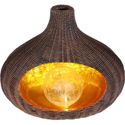 Diese formschöne Globo LED-Solaraußenleuchte Skulptur aus braunem Kunststoff ist eine wunderschöne Ergänzung für Ihren Garten, Ihre Terrasse oder Ihren Balkon. Das solarbetriebene LED-Leuchtmittel ist von einer gläsernen Kugel in schöner Crackleoptik umschlossen. Außerdem ist die Innenseite der 24,5 cm großen Solaraußenleuchte golden getönt, was zusammen mit dem angenehm warmweißen Licht (3000 Kelvin) des LED-Leuchtmittels zu einer stimmungsvollen Atmosphäre sorgen kann.
