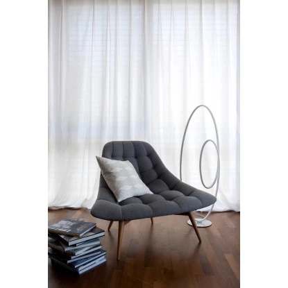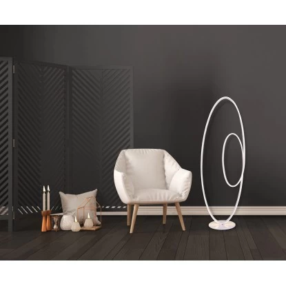 Geschwungene Leuchtstreifen bilden das extravagante Design der Serie Odrive. Schleifenähnlich und wellenförmig schwingt sich der LED-Streifen, mit hell leuchtenden 2260 Lumen und warmweißen Licht (3000 Kelvin) in Ihrem Raum entlang. Die Stehlampe hat eine Höhe von 120 cm, eine Breite von 25 cm und eine Länge von 40 cm.