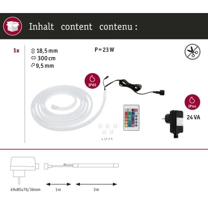 Das Paulmann SimpLED LED Strip Outdoor RGB Komplet-Set ist ein beeindruckendes Set mit einer Länge von 3 Metern, das ein homogenes Lichtbild ohne sichtbare Lichtpunkte erzeugt. Es eignet sich perfekt für den Einsatz am Carport, auf der Terrasse oder unter dem Dachüberstand. Die Stripes verfügen über eine hohe Anzahl von LEDs und erzeugen eine flexibel zu verlegende Lichtlinie.
