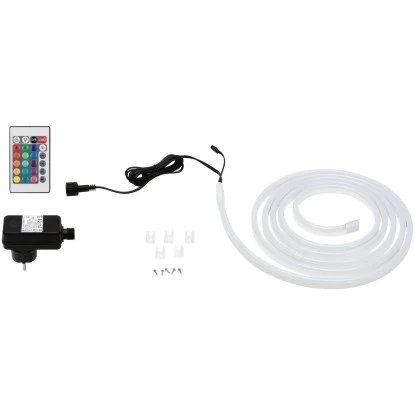 Das Komplett-Set ist inklusive Steckertrafo sofort einsatzbereit („Plug & Play“). Mit der RGB-Technik können Sie die Farbe individuell per Fernbedienung einstellen. Der integrierte Memory-Effekt speichert die zuletzt eingestellte Farbe beim Ausschalten. Die minimale Komponentengröße durch den im Stripe integrierten Empfänger erleichtert die Installation. Zudem bietet die Beschichtung Schutz vor Staub und Spritzwasser, sodass die Stripes auch im Freien verwendet werden können.